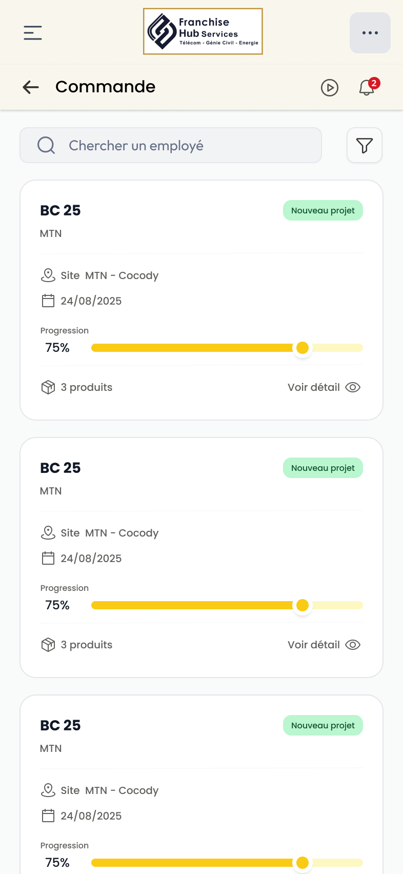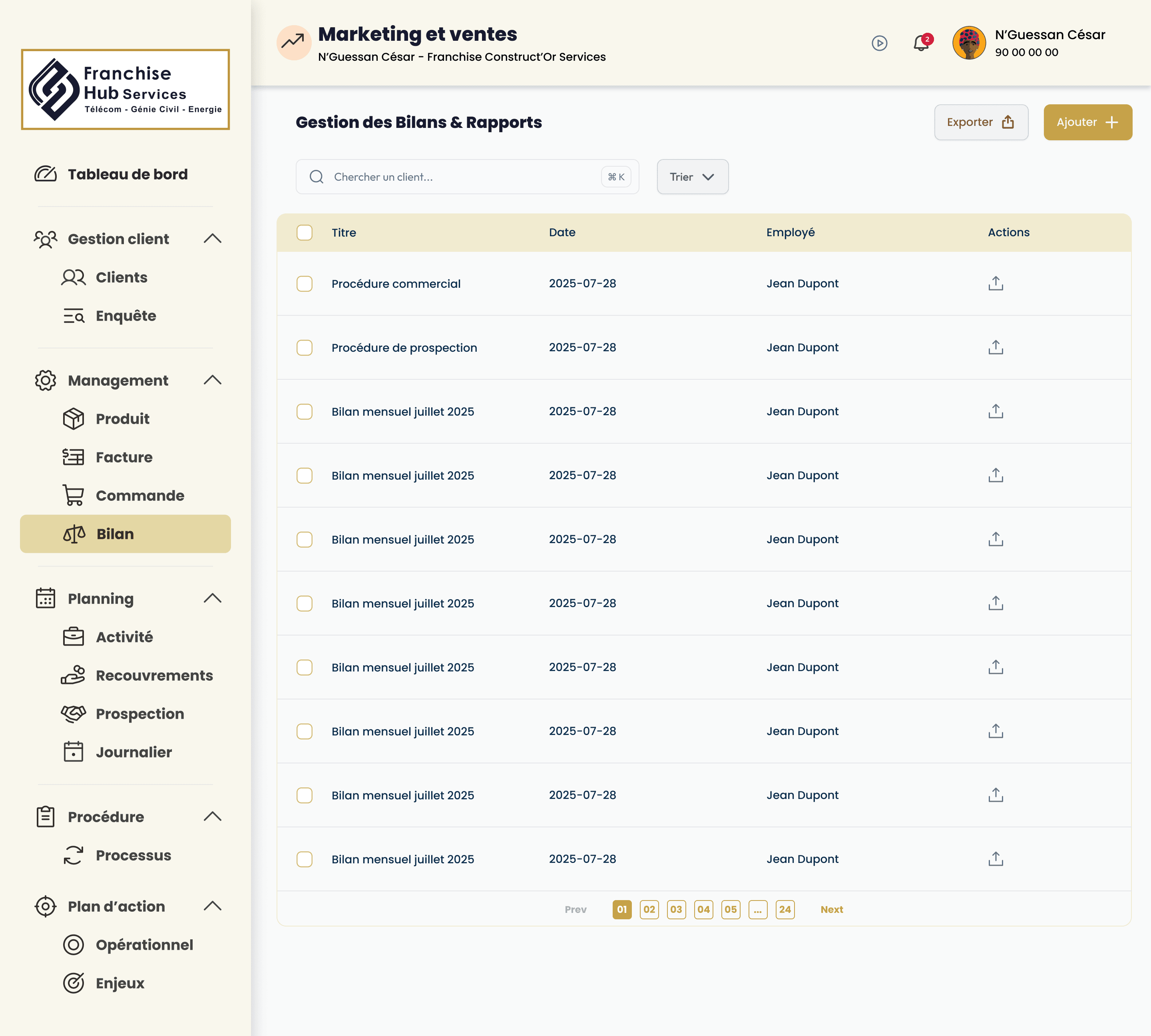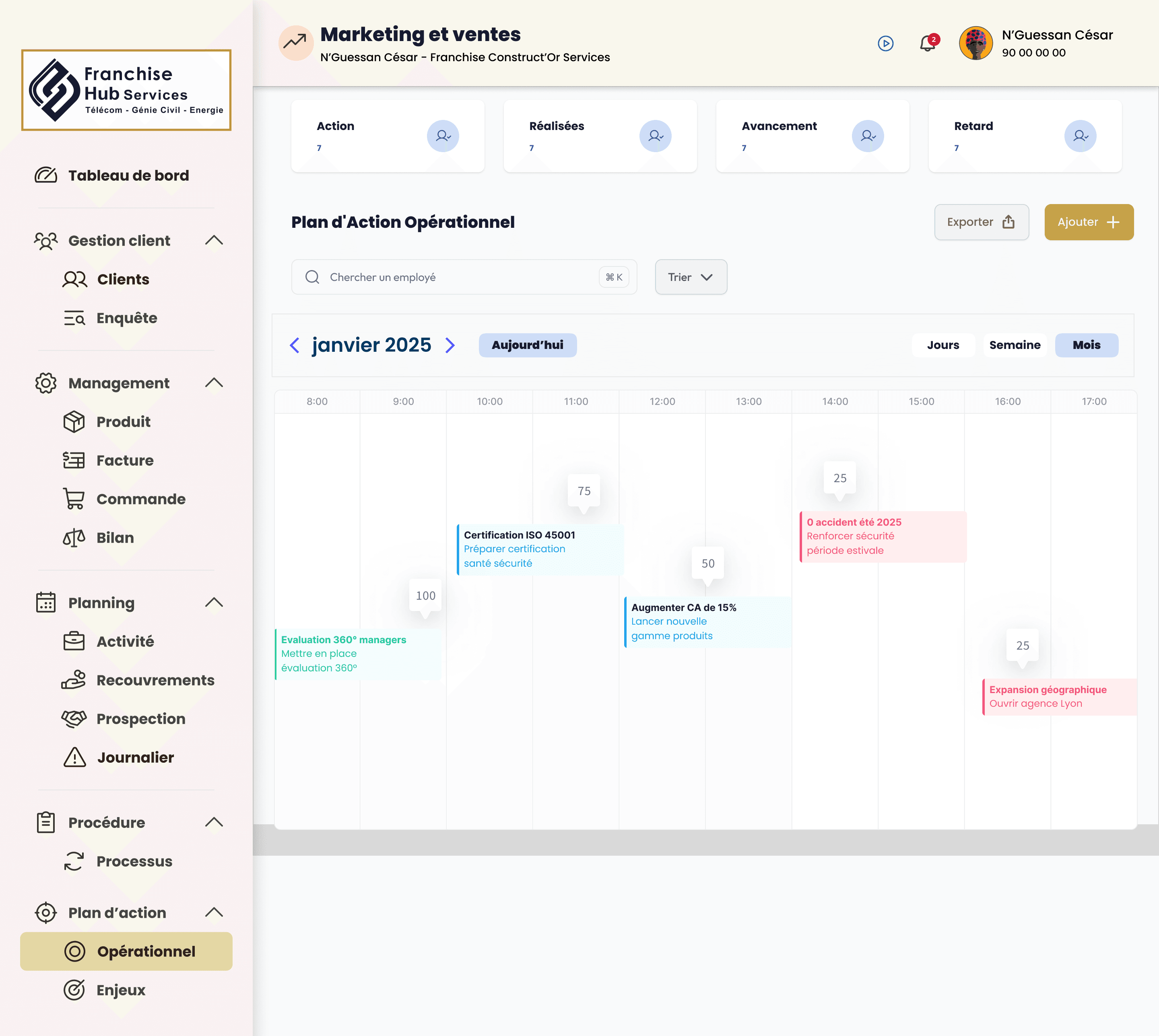 Franchise Construct'Or Services est une plateforme pensée pour accompagner le réseau franchise : centralisation des données, pilotage opérationnel et expérience cohérente sur le web comme sur mobile, au service des équipes terrain et du siège.