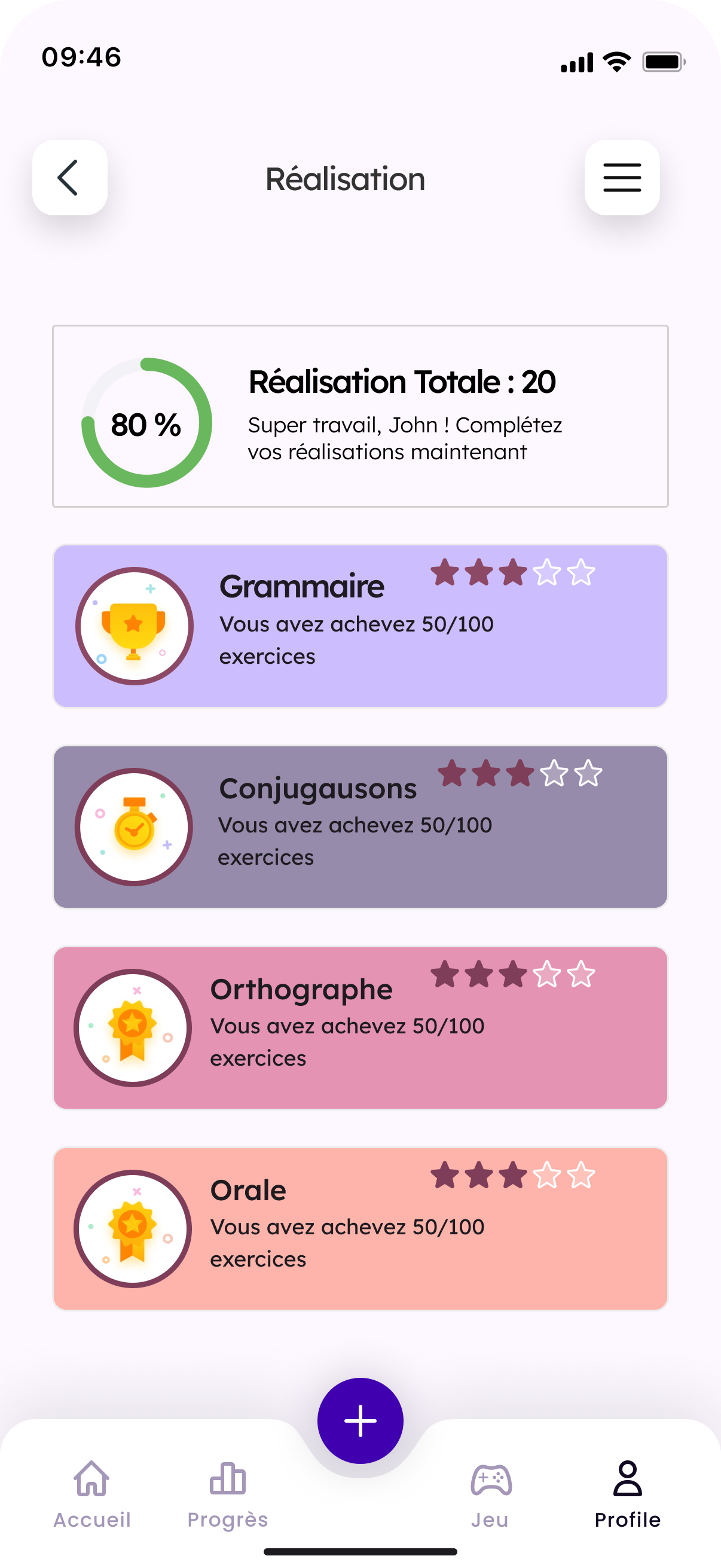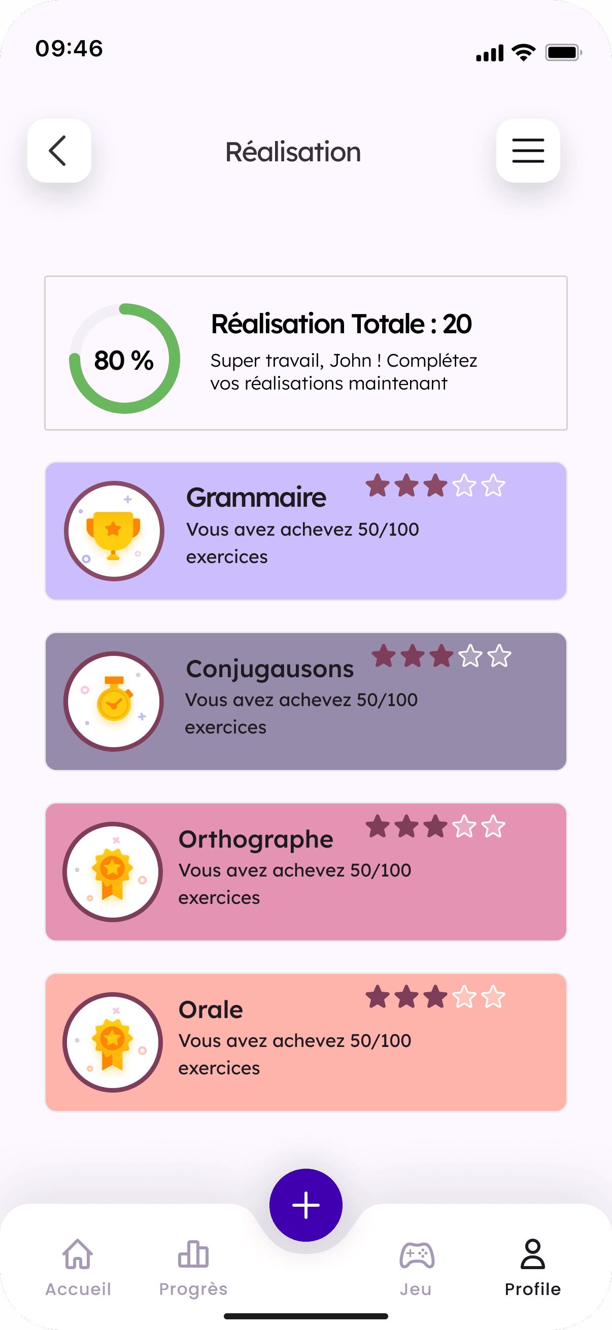 Les parcours combinent grammaire, conjugaison, orthographe et oral, avec des exercices interactifs, un retour immédiat sur les réponses et un tableau de réalisation pour visualiser la progression.